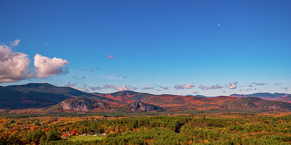 Looking out from the slopes of Cranmore Mountain Ski Area, the brilliaint colors of autumn paint the distant moiuntains. In the distance the granite face of Cathedral Ledge can be seen.