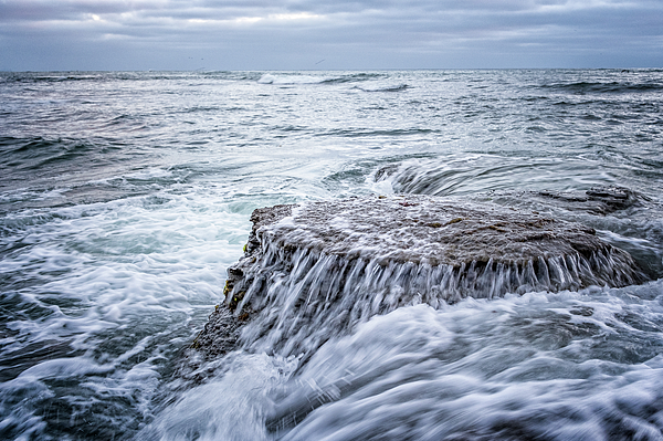 The waves wash over a large rock with a circular flat top. As the water recedes water remaining atop the rock gently cascades over its edges.