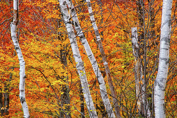 Brilliant white birch trees stand against a backdrop of autumn fire in New Hampshire's Evans Notch. .