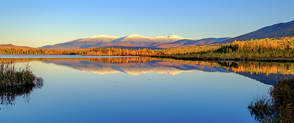 Looking across mirror smooth Cherry Pond, the snow capped peaks of the Presidential Range looms in the distance, as well as being perfectly reflected on the glassy surface of the pond.