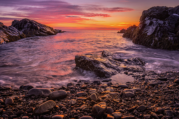 Wet rocks glistening gold, first light along the coast of Maine.
