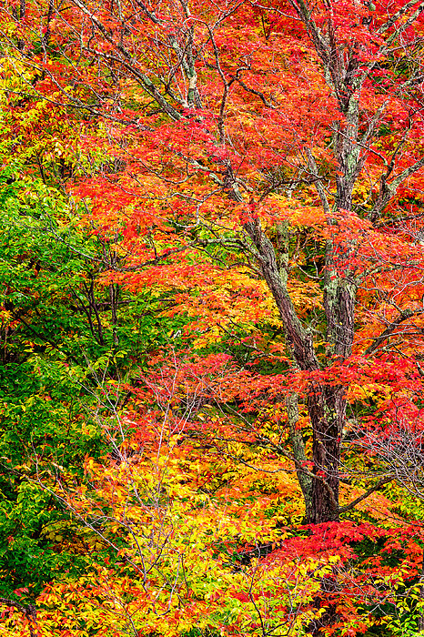 The brilliant colors of autumn fill the frame with a large maple, its leaves a vibrant red, with bright yellow birch leaves in the lower portion of the frame and the still green leaves of a beech tree along the left side of the image.